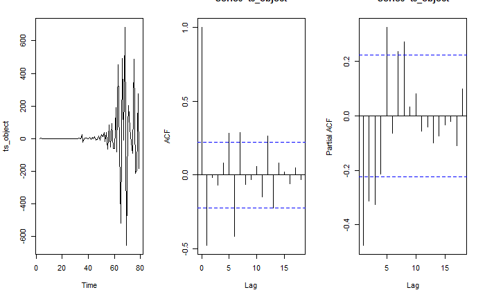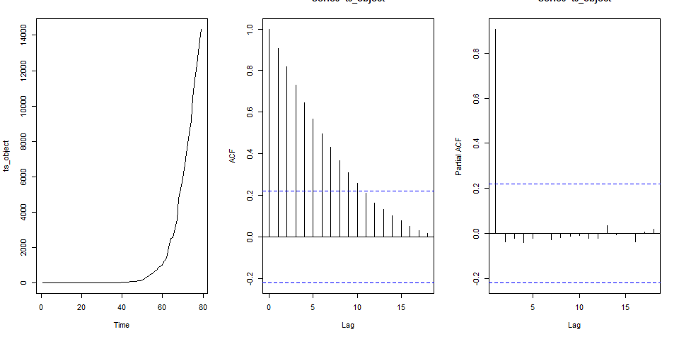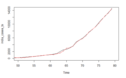 Data was taken for India, and the preliminary plots were visualized. Data was from 30^th^ January to 17^th^ April and contains about 79 data points. This was converted into a time-series data object. It is not surprising to see that there is an increasing trend in the data. Post the initial few days, the number of cases has risen exponentially (which already suggests non-stationarity). The augmented Dickey Fuller test results in a p-value of 0.99, and this implies non-stationarity (failed to reject H0).