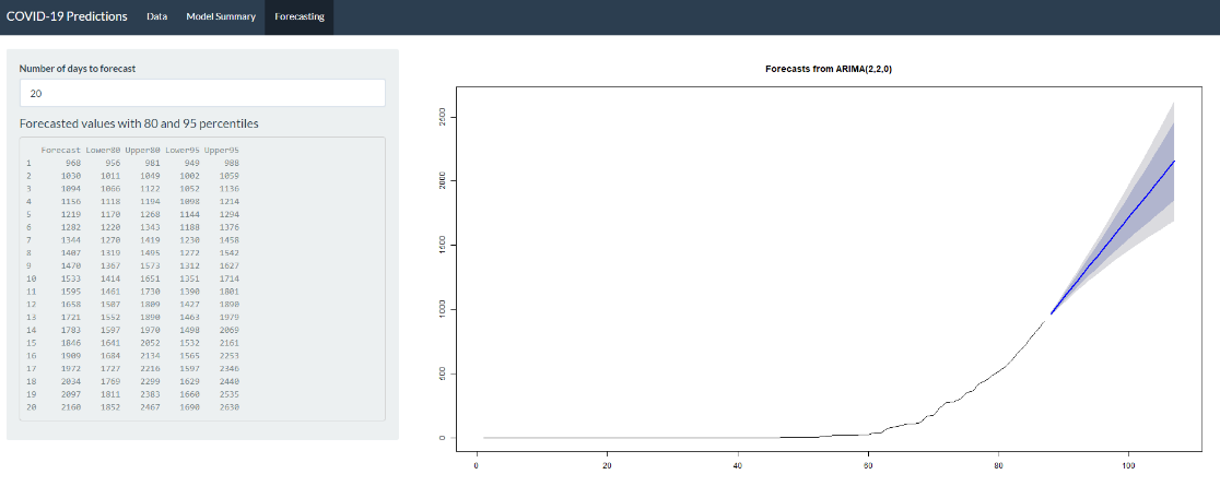 In addition to this plot, we also have a table in the side panel which shows the values of the forecasts along with the values for upper and lower bands for 80% and 95% confidence. The minimum number of days to look at the forecast is set to 0 and the maximum number is set to 30.