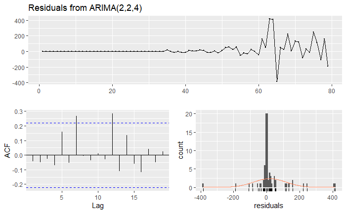 The time plot shows some variation in the data. The histogram for the residuals suggest normality in both the cases (better for ARIMA(2,2,4) model). The auto-correlation plots show a couple of significant spikes at certain lags for both the models. The auto-correlation is not large and the residuals provides a favorable Box-Ljung test result. The residuals appear to be random. In fact, only the only model with ACF(residuals) within limit was the ARIMA(4,2,4), but the Box-Ljung test suggested a lack of fit.