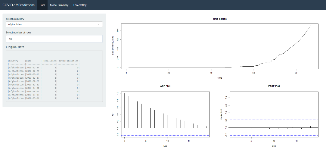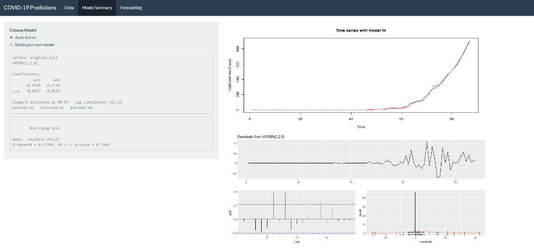 The time-series data was used in this project to model and forecast the total # of cases into the future. The main aim was to design a model for the time-series data and forecast the number for the future. Data was chosen was a single country, India, for this purpose. A R-Shiny dashboard was designed and built to scale the models to all the countries. This provides the flexibility to the user to select a country and create a model of their choice to achieve a forecast.